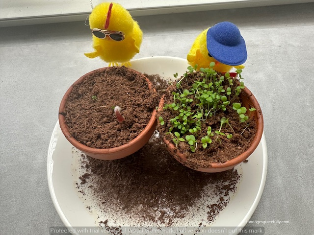 Mijn moeder had ook nog zaadjes gegeven met haar verjaardag en ook daar komt al wat van op in de kleine potjes dus dat kan straks ook de tuin in. De ene zijn vergeet me nietjes en de andere ben ik wel vergeten haha dat waren in elk geval kleine bolletjes.
