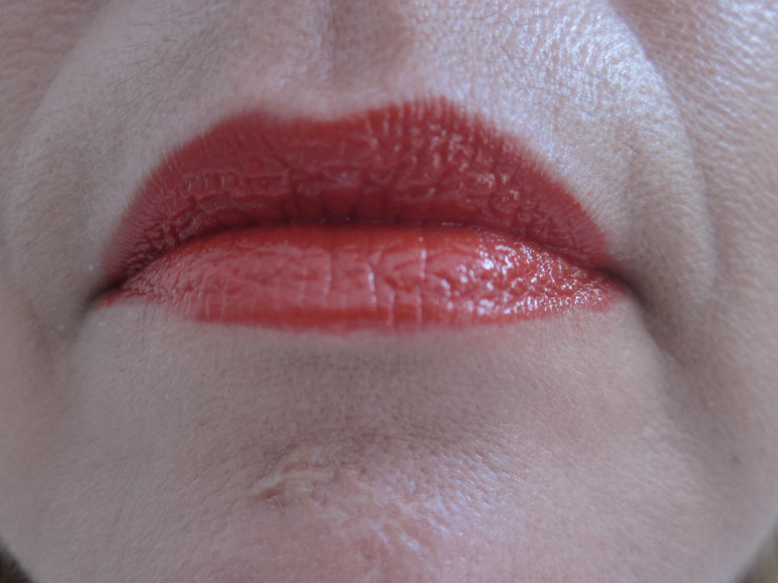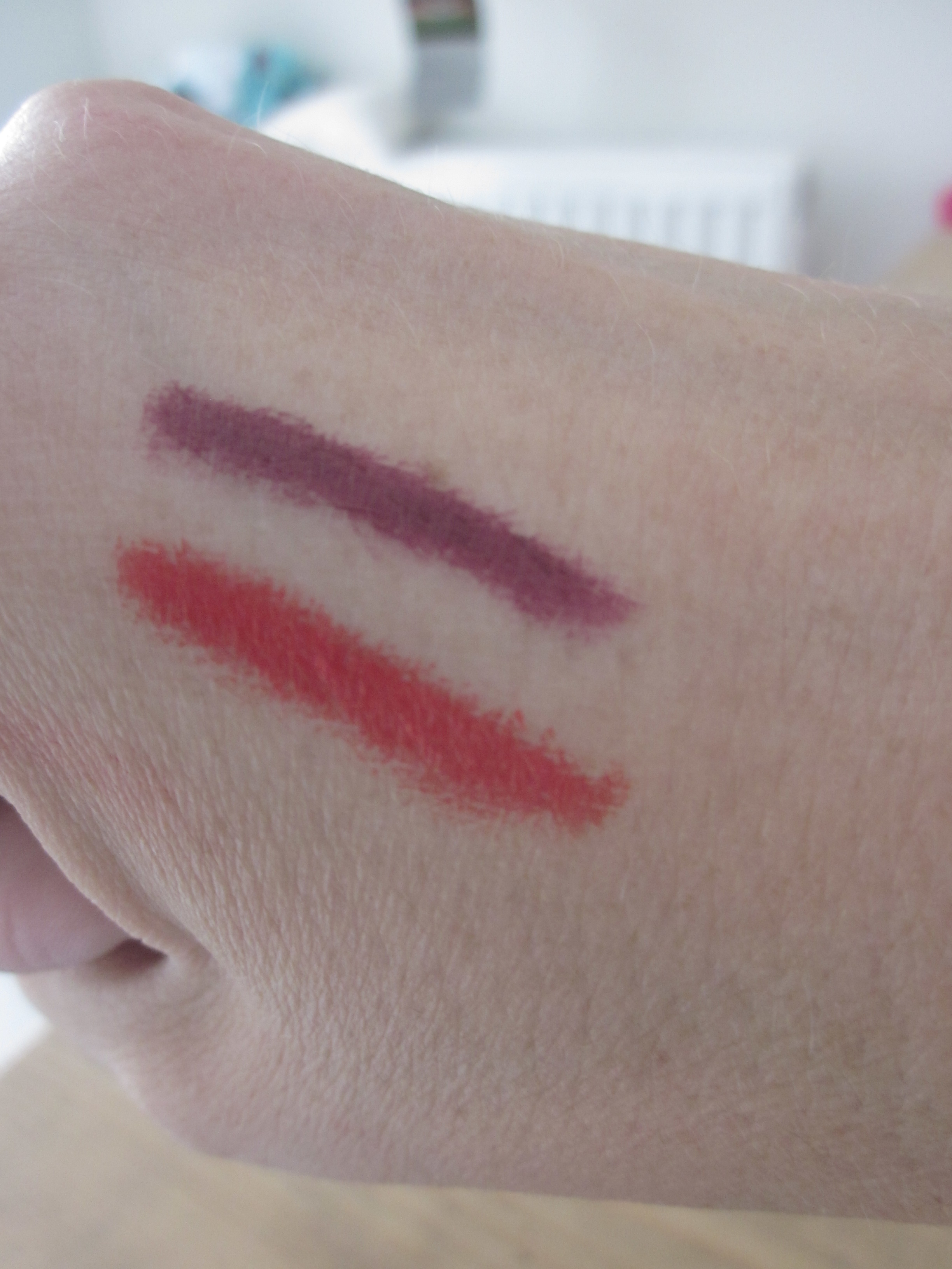 Ik ging voor de kleur 410 Fab Orange een mooie oranje/rode kleur. Als je de kleur opbrengt voelen je lippen gelukkig niet droog aan. Ze zijn redelijk mat van kleur (links). Zelf vind ik het iets prettiger om even een klein likje labello over de lip pencils aan te brengen (midden) voor een klein glansje. Met deze kleur kan het wel zijn dat je tanden iets geler ogen.