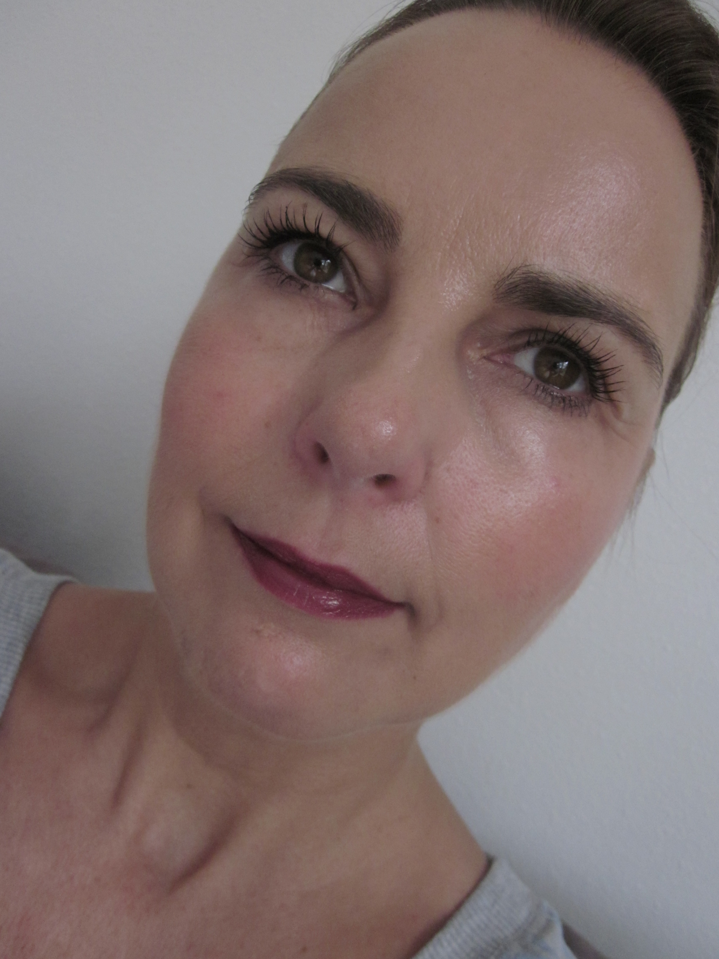 De andere kleur is 310 Berry Much  een mooie dieppaarse kleur, perfect voor dit najaar. De lip pencils blijven zoals gezegd echt wel een paar uur goed op de lippen zelfs na een hapje en wat te drinken. Bijwerken hoeft dus niet regelmatig te gebeuren. Links is weer aangebracht zonder toevoeging van de Labello, midden is met een beetje Labello.