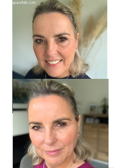 Ja, heel mooi geworden! De vouw bij je mondhoek is een stuk minder (die marionettenlijn) geworden, veel zachter dan eerst. En zeker bij je ogen is het goed te zien, echt een heel groot verschil. Als ik een foto van mijzelf zie dan stoor ik mij het meest aan mijn hals, zo net onder de kin. Kippennekje…brrr… en afhangende mondhoeken vind ik ook vreselijk, alsof je altijd chagrijnig bent.