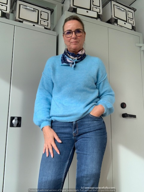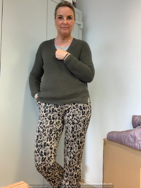 Op maandag droeg ik een nieuw vestje dat ik vorig weekend kocht, mooi in Lila. Op dinsdag de broek van mijn 2-delig pak aan en beetje in camouflage stijl dus, met het jasje vond ik het net een beetje too much. Op donderdag een jeans met de mooie blauwe trui.