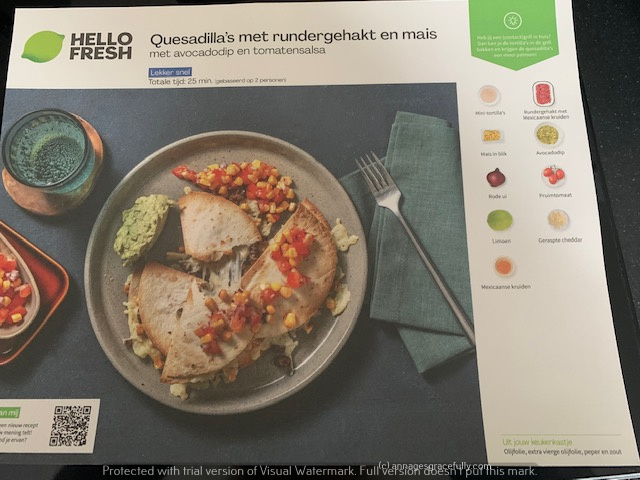 Uit de box hadden Linguini met kipgehakt, boerenworst met aardappeltjes en sperziebonen, en Quesadilla’s.
