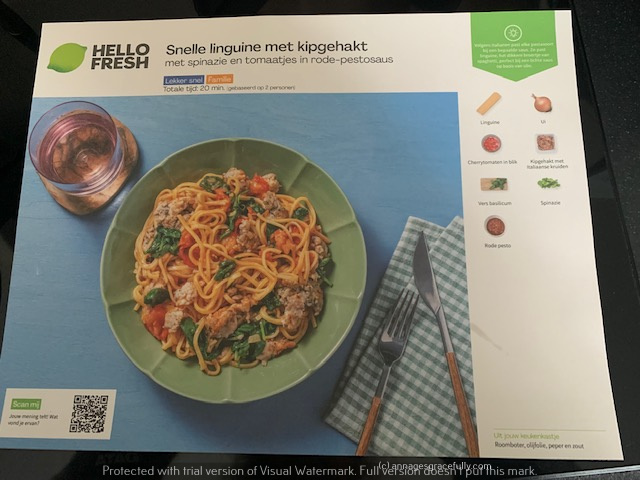 Uit de box hadden Linguini met kipgehakt, boerenworst met aardappeltjes en sperziebonen, en Quesadilla’s.