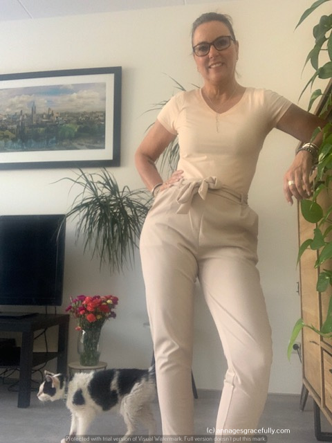 Maandag droeg ik een zalmrose t-shirt met beige broek. Skoet wist er een flinke haal in de maken ☹ en potverdrie in de middag lag ze naast me, rekte zich uit en haalde nog een keer een flinke haal in de broek. Ik ben echt pissig op haar geworden – al kan ze er niet veel aan doen, ze kan haar nagels gewoon niet meer goed onderhouden – maar het is het zoveelste kledingstuk dat sneuvelt en deze broek had ik nog maar kort. Je kunt de haal wel naar binnenhalen maar je blijft een lelijke ‘streep’ zien. Echt balen.