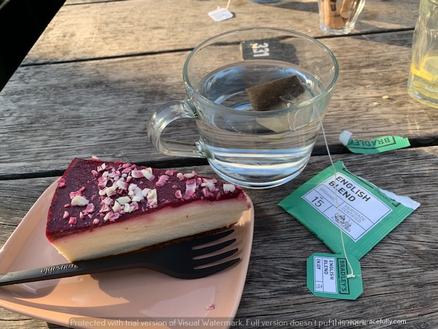 Vrijdag heb ik heerlijk met mijn dochter een flink stuk gewandeld en s’middags kwam er een appje van vrienden of we gezellig wat gingen eten? Ja, heel gezellig en ook buiten gezeten al werd het op het einde wel echt frisjes. Vergeten foto’s te maken van het lekkere eten maar bij het toetje dachten we eraan. Het was Witte chocolade cheescake met frambozen. Zalig!
