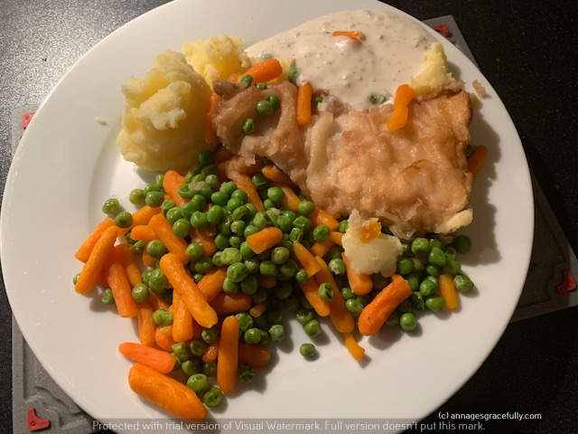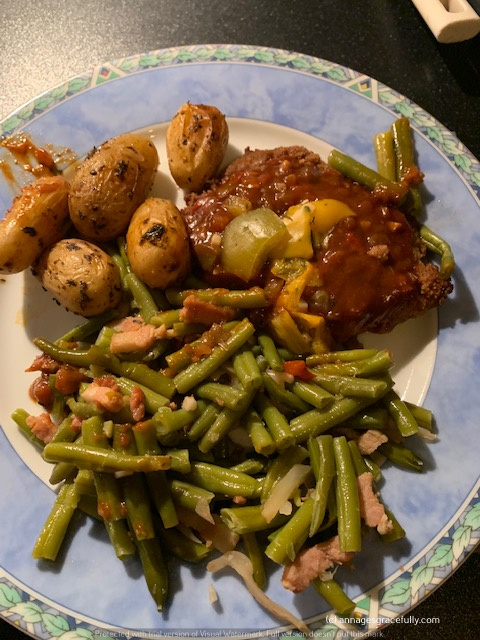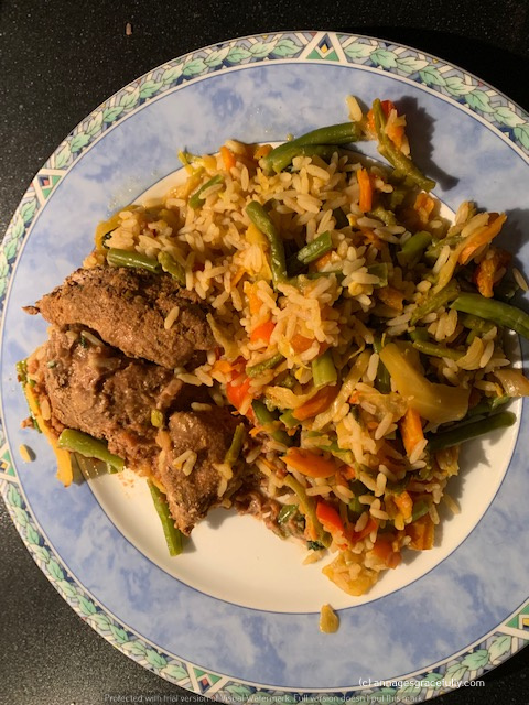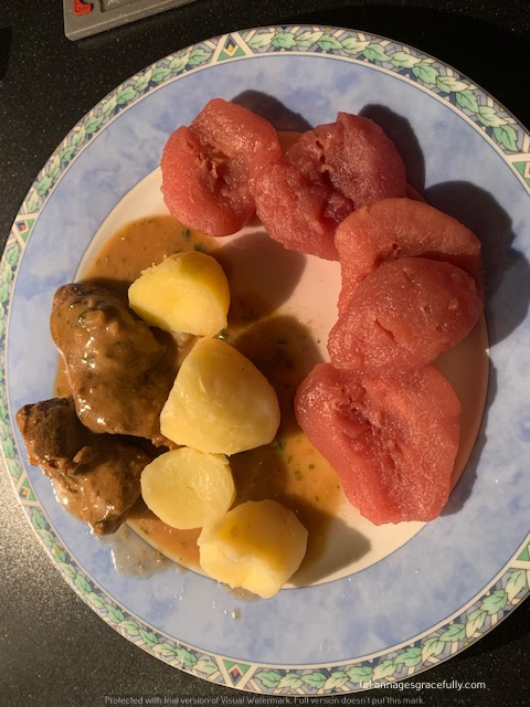 Ik heb weer heerlijk gegeten deze week. Ik had onder meer stoofpeertjes (die waren echt zalig), rijst met groente en saté/ossenhaas. Een lekkerbekje met doperwt/wortel en aardappeltjes en een ‘sudderburger’ (met een stroganoffsaus), sperzieboontjes en varkenshaas. Was helemaal dik in orde weer.
