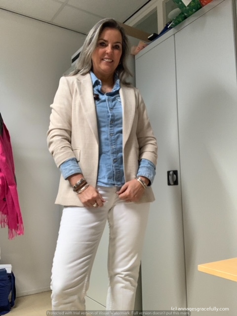 Groen, grijs en blauw waren een beetje de kleuren dan deze week. Op woensdag had ik zin in wat lichters dus haalde ik mijn lichte spijkerbroek van stal met het beige blazertje van de H&M van mij mag het voorjaar komen maar we moeten nog een koufrontje tegemoet zien geloof ik komende week, jammer 😉