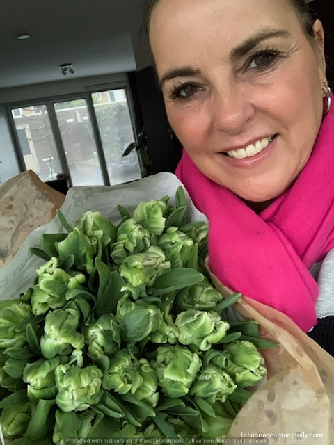 Op de markt – bliksembezoek door het slechte weer kocht ik alleen kaas en deze leuke papagaaibektulpen, benieuwd of ze mooi uitkomen. Van W had ik ook weer een prachtige bos gekregen.