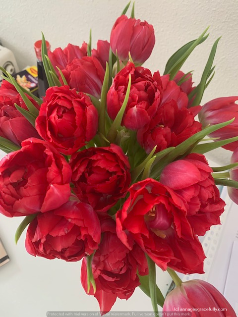 Mijn bloemen stonden er zo prachtig bij deze week. De freesia’s vormden echt een witte wolk en alle bloemetjes waren volledig open gekomen. De tulpen waren ook echt prachtig maar hielden het niet zo lang vol, donderdag vonden ze het mooi geweest en vielen de blaadjes uit. Omdat ik niet naar de markt ging zaterdag bij de appie even roosjes meegenomen.