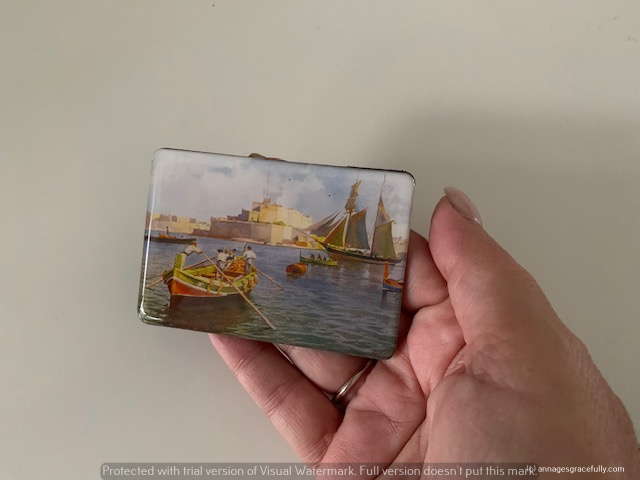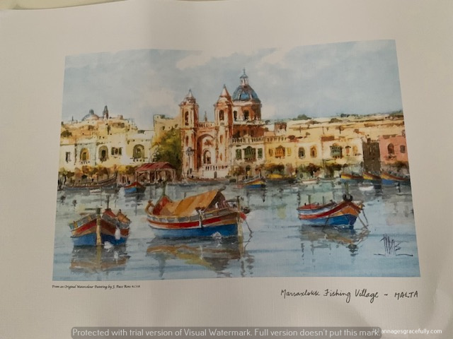 In Italie vorig jaar nam ik ook al eens een ets tekening mee en nu dus weer. Ook dit vind ik een leuk aandenken. Van de week even een lijstje kopen en dan mag deze op de wand in mijn slaapkamer waar ik ook een verzameling heb van foto’s en aandenken van mijn reizen. Zo’n ets tekening kost ook bijna niets. Hij is 20×28 cm dus past in een a4 fotolijstje en je hebt een leuk kleurig aandenken. Ook heel blij mee. Wel moeilijk om een keuze te maken want ze hadden echt hele leuke maar deze vond ik wel een typisch Maltees beeld geven met die bootjes in de haven en een mooi oud gebouw op de achtergrond.