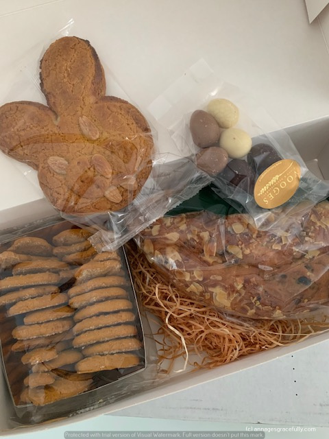 Op het werk kregen we ook weer een heerlijk Paaspakket. Er zat een paasbrood in, een pak koekjes, en klein zakje chocolade eitjes en een gevulde koek in de vorm van een paashaas 😊. Helemaal leuk maar weer veel te veel voor mij alleen dus de helft van het pakket vrijdag naar mijn ouders gebracht, konden die ook lekker mee smullen.