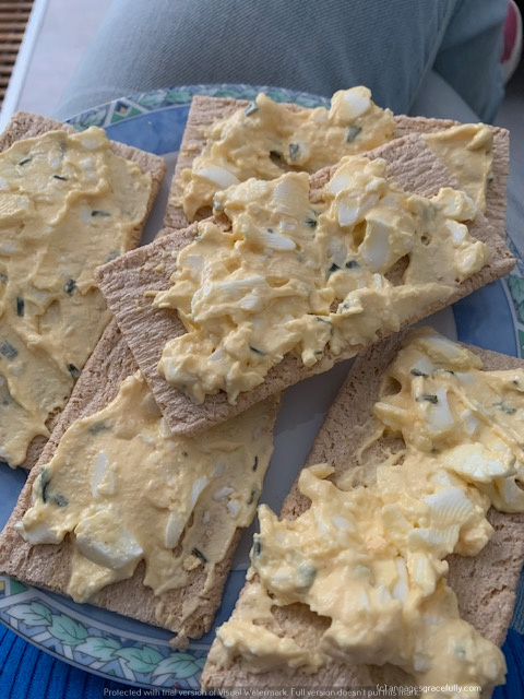 Ik at lekker crackers met ei-salade daar had ik ineens zo’n zin in. Helaas vond ik deze crackers van de Lidl niet zo lekker. Die van het huismerk van de AH smaken beter (het zijn van die cracotte/Lu crackers). Ook nam ik weer eens een rol beschuit mee (vezelrijk) ook zo’n trek in ineens. Had ik jaren niet meer gegeten beschuit – volgens mij mee gestopt toen ik mijn beugel kreeg omdat ik toen niet kon afhappen).