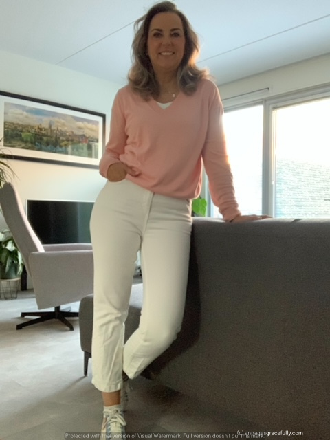 2. Leuk staat die witte broek en roze pullover je. Zo jammer, ik kan nooit die goedkope leesbrillen kopen, ik heb altijd direct het gevoel dat ik dan “scheel” kijk en dan word ik een beetje misselijk. Alleen die van de Hema/Jumbo verdraag ik.