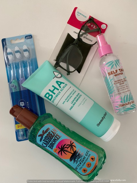 Wat ging er wel mee naar huis; een nieuw leesbrilletje voor in mijn handtas, 1,99 was deze -leuk in het groen- met een hoesje er zelfs bij. Die nu in mijn tas zat was van het Kruidvat en omdat deze los in mijn tas zat waren de glazen nogal beschadigd, nu dus netjes met hoesje in de tas 😊. Ook nam ik een flesje aftersun mee (alvast voor eind juni als ik een weekje naar Kos ga), een scrub voor het lichaam en een self-tan spray. Oh ja, en een setje tandenborstels ook handig voor in de toilettas voor vakantie.
