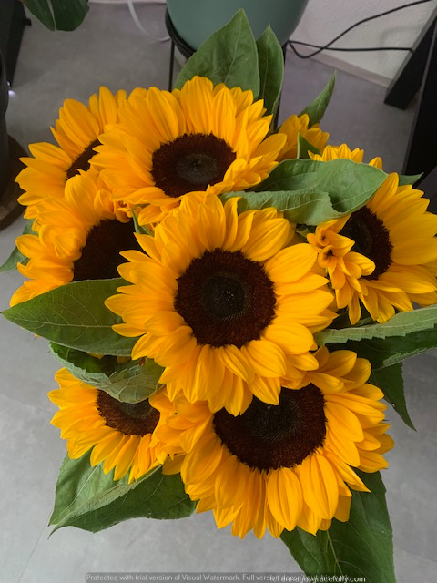 De zonnebloemen die ik vorige week vrijdag kocht stonden er prachtig bij. Ik heb wel het vermoeden dat dit de oorzaak is van mijn ontstoken oog. De stengels van zonnebloemen zijn heel harig. Ik heb ze afgelopen vrijdag een stuk afgeknipt om ze mooi in de vaas te krijgen. Op vrijdagavond begon mijn oog te irriteren. Ik heb slecht geslapen en veel pijn gehad. Gelukkig bleef mijn zicht goed maar wel erg rood, pijnlijk, tranen en gezwollen.