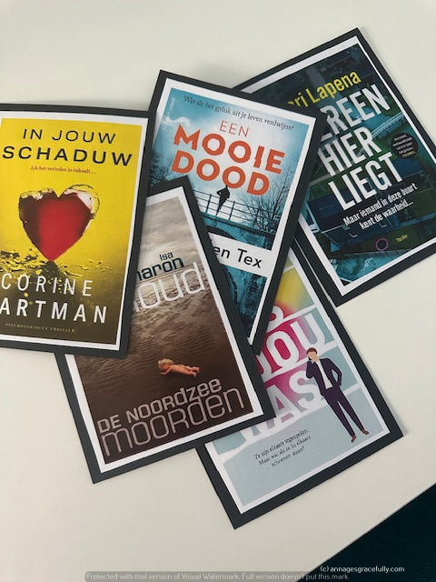 Voor mijn kaartenrek ‘knutselde’ ik weer wat boeken in elkaar 😊Ik maak dan printjes van de kaft en de korte inhoud en die knip ik op maat en gaan op een zwart kartonnen kaartje. Zo heb ik toch een boekenkast maar wel 1 die nauwelijks ruimte in neemt. Leuke manier ook om zo mijn gelezen boeken bij te kunnen houden. Ik ben aardig op dreef en ben aan boek nummer 56 bezig op het moment.