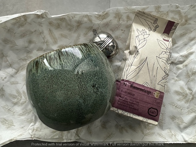 Van Henk-Jan kreeg ik nog deze lekkere grote theemok, met winterthee en een thee-ei. Heb er al een paar koppen van op en is erg lekker ook.