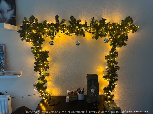 Ik heb ook een begin gemaakt met de ‘kerstboog’ boven de eettafel. Het groen hangt en de lampjes zijn erin gehangen. Nu moet ik nog wat versiering erin gaan doen. Ik denk dat ik volgende week zondag misschien mijn boom ga optuigen – even kijken of het uitkomt – en dan kan ik ook zien wat ik aan versiering heb of wat ik nog misschien kan kopen. Ik denk dat ik het ‘klassiek’ houd dus met wat rood en groen want mijn kerstboom is altijd al een hysterische chaos 😊.