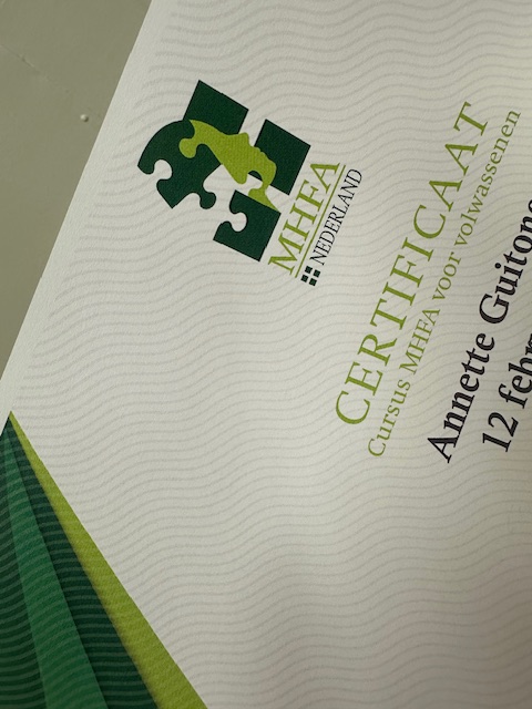 Dinsdagmiddag sloot ik mijn cursus Mental Health first aider af en op woensdag – ik werkte die dag thuis – gelijk maar de certificering gedaan. De stof zat toen nog vers in het hoofd. Mooi dat de werkgever hierin investeert en ik heb voor de komende 3 jaar mijn ‘diploma’ daarna moet ik op herhaling.