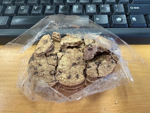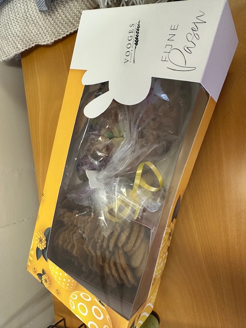 Donderdag vond ik onderin mijn tas nog een koekje – nou ja – haha het was meer kruimel maar evengoed prima om even de tussendoor trek te stillen. Ik gooi meestal wel wat koekje of mueslibars in mijn tas dat als ik een keer trek heb dat ik altijd wel iets bij me heb. Denk dat deze wel een tijdje onderin heeft gezwerft 😉. We kregen ook ons Paaspakket mee naar huis, een paar chocoladeeitjes, een gevulde koek in de vorm van een haasje, een klein krentebrood en een pak paaskoekjes. Altijd lekker natuurlijk.