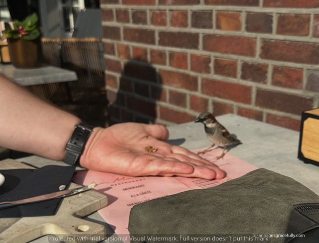Vrijdagavond gingen Henk-Jan en ik uit eten. Het was prachtig weer dus een tafeltje buiten op het terras aan de haven van Huizen. Twee musjes waren op boevenpad. De eerste probeerde ons af te leiden door rechts van ons te zitten kwetteren (heel dichtbij) waardoor wij naar deze mus gingen kijken natuurlijk waarbij mus nummer 2 de andere kant ons tafeltje op sloop en probeerde ons broodje te bemachtigen 😊 slimkezen! Haha ze waren zo mak dat ze dus zelfs het brood uit de hand kwamen halen. We hebben overigens echt heerlijk gegeten.