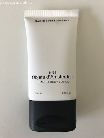 Bij het openmaken trof ik 3 luxe travelsizes aan, een hand- en body lotion en een douchegel in een werkelijk waar goddelijke geur. Voor zover ik kan nakijken had ik de geur no 92 Objets d’Amsterdam. Dit lees ik over de geur op hun website: