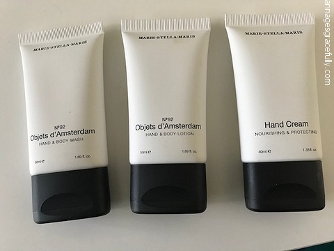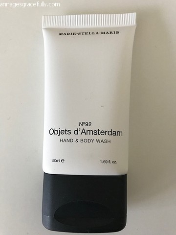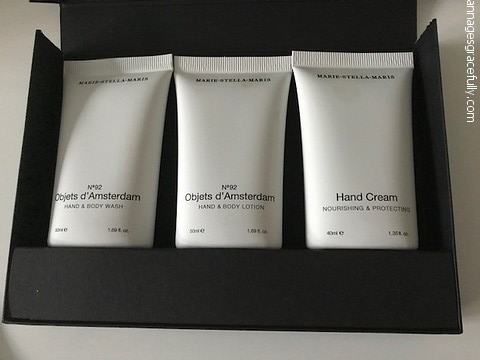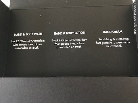 Bij het openmaken trof ik 3 luxe travelsizes aan, een hand- en body lotion en een douchegel in een werkelijk waar goddelijke geur. Voor zover ik kan nakijken had ik de geur no 92 Objets d’Amsterdam. Dit lees ik over de geur op hun website: