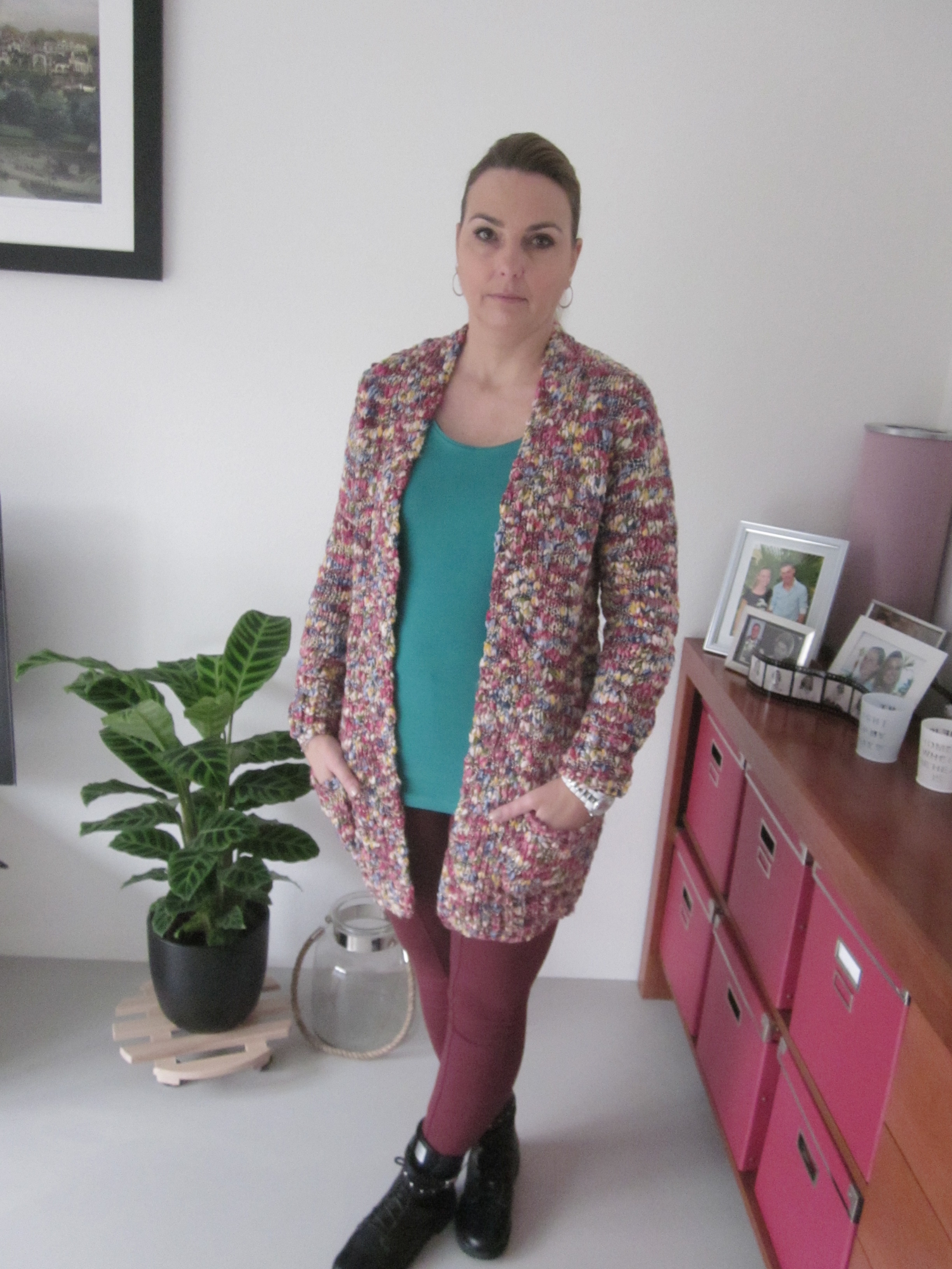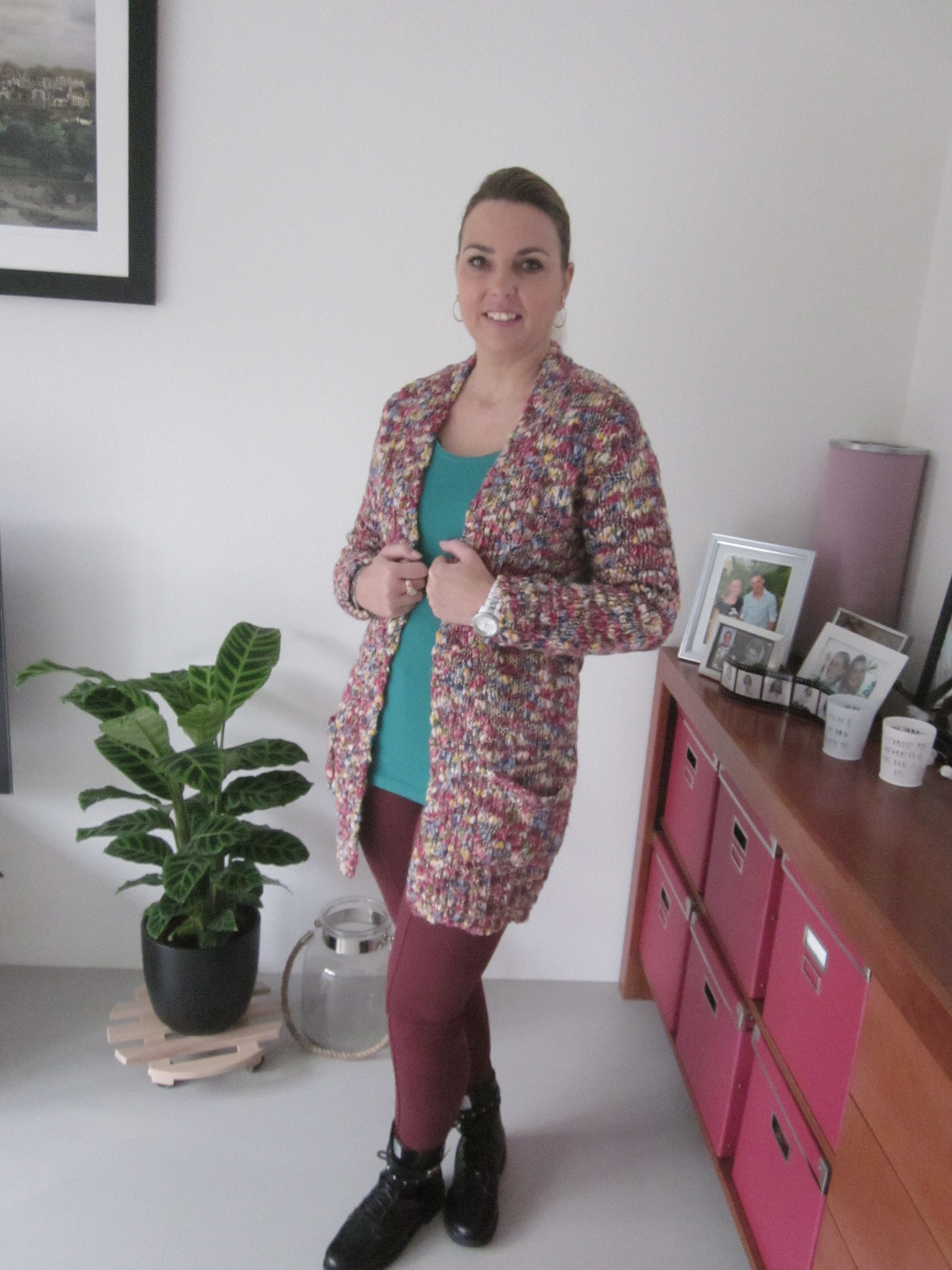 Dit keer kocht ik twee vesten en twee basic shirts die alle vier onderling te combineren zijn. Ik houd erg van kleur. Voor mij geen zwarte kleding. Ik heb welgeteld 1 zwarte broek in mijn kast en that’s it. Echt waar. Kleur it is! Dit leuke veelkleurige vest trok dan ook gelijk mijn aandacht en verdween al snel in het winkelmandje :). Gecombineerd met dit leuke groene basic shirt staat het lekker vrolijk in de donkere dagen van Januari.
