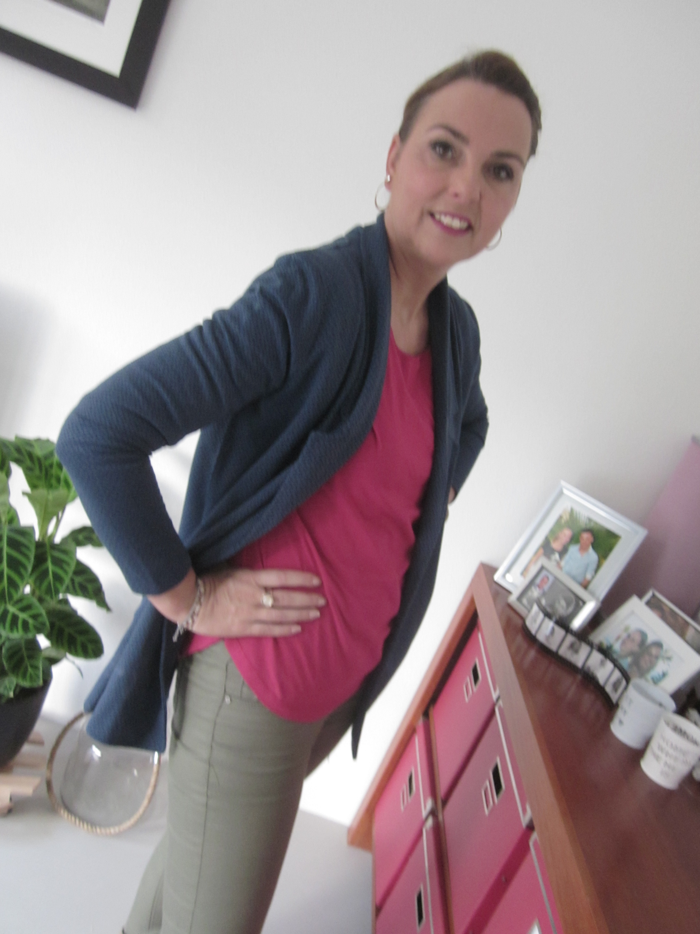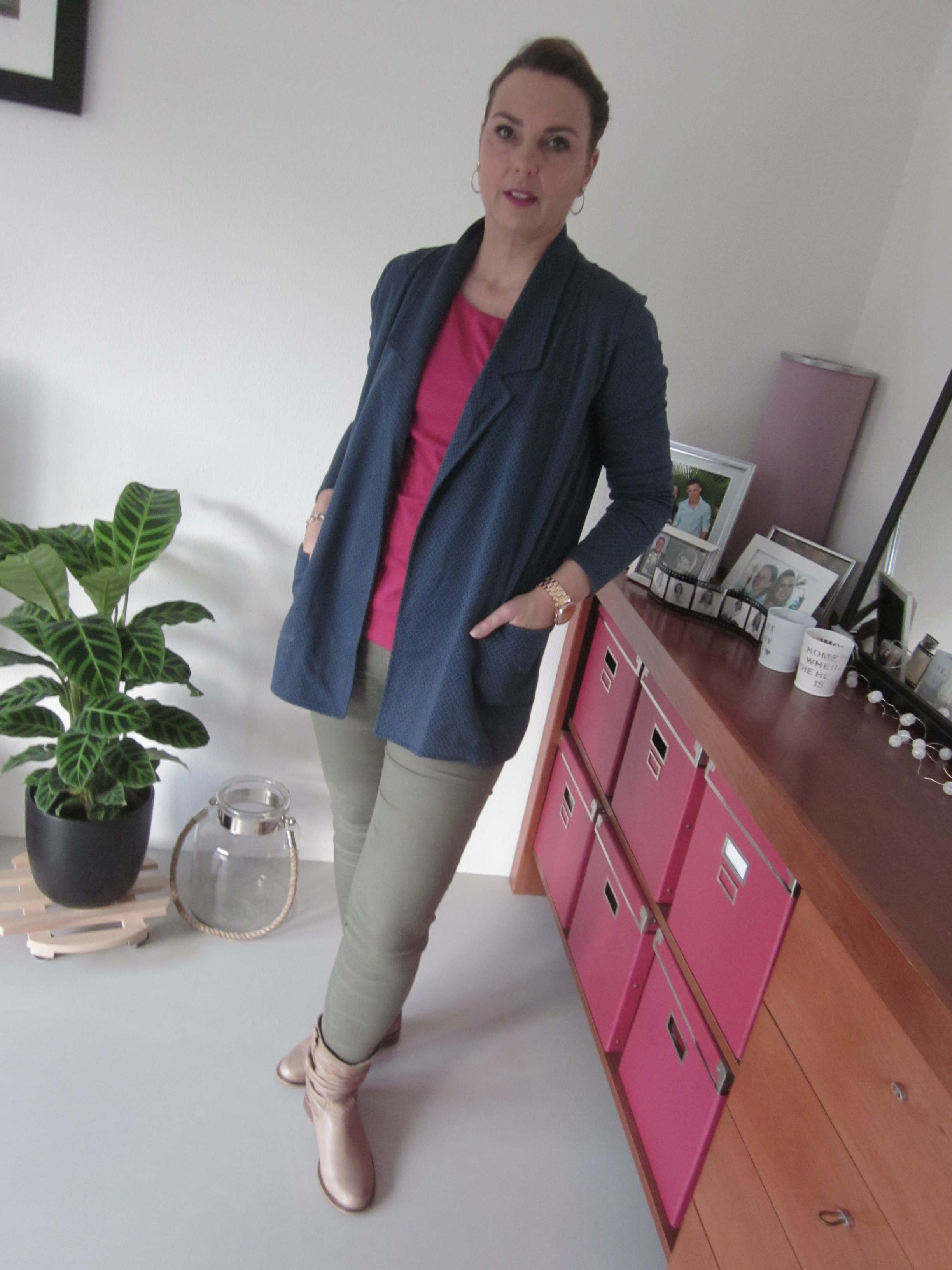Ik houd sowieso veel van vestjes. Het is makkelijk te dragen en aangezien ik het snel koud heb is het ook handig om aan of uit te trekken mocht ik het toch (te) warm krijgen. Dit blauwe vestje dat een beetje de uitstraling heeft van blazer is ook erg leuk. Ik combineer hem hier met een lekker vel shirt in de kleur Fuchsia/Cerise.