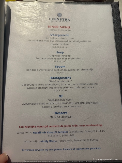 Donderdagmiddag mochten we ons melden aan de kade in Arnhem voor een heuse kerstreis. Het inchecken verliep uiterst soepel en de koffers werden netjes naar de hut gebracht. We zaten helemaal aan het einde van de gang. Mooie hut – wel met twee aparte (en best smalle haha) bedden. Prima douchecabine en plek genoeg om je spulletjes op te bergen. Na een welkom praatje en dito cocktail (voor ons alcohol vrij) stond het eerste diner op de planning.
