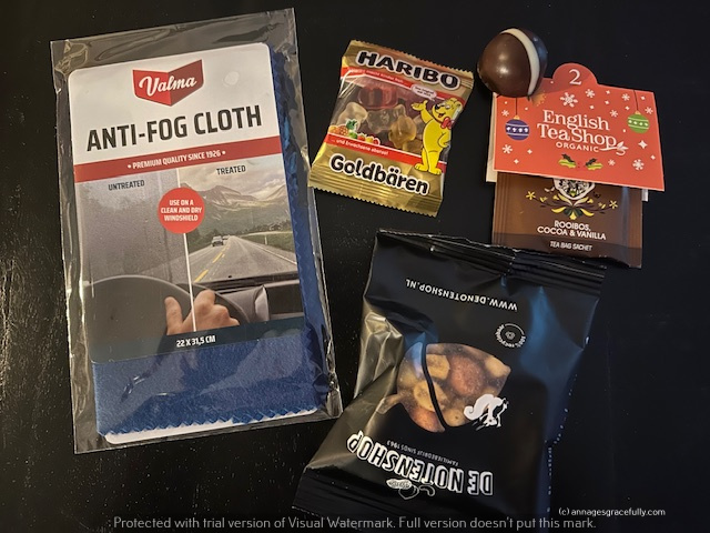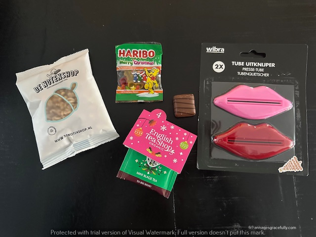 Ze stonden natuurlijk al een tijd naar me te roepen maar nu mocht ik dan eindelijk de eerste vakjes van de adventskalenders openmaken. Toch een feestje en helemaal die van Ilona want die had ik vorige week natuurlijk nog als verrassing van haar ontvangen. Lekkere douchegels, een anti-condensdoek voor in de auto (superhandig!) van die lipjes waarmee je tubes lekker goed leeg kunt knijpen, een chocoladeletter en een chocoladetablet echt allemaal heel leuk en lekker natuurlijk.