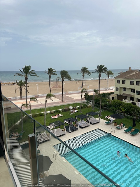 Prachtig hotel waar we verbleven. We zaten ongeveer 15 kilometer buiten Valencia in het hotel Estimar in las pueblo de Farnals. Vanuit de kamer keken we op het zwembad maar ook lekker op de zee. Het hotel is geloof ik pas een jaar of 2 oud en dus zag alles er nog spik en span uit. 4 sterren en op de kamer lag een zonnehoed en strandtas, slippers voor ons beiden (nu ging dat voor maatje 47 niet lukken 😉) een voeten crème, tandenborstels en allerlei bad/doucheproductjes, een roomspray echt wel erg chique allemaal. Het ontbijt was ook erg goed, ook veel keuze voor suikervrij en glutenvrij en een zeer ruime keuze. Ook hebben we 2x in de avond bij het hotel gegeten en dat was ook echt heel erg goed allemaal.