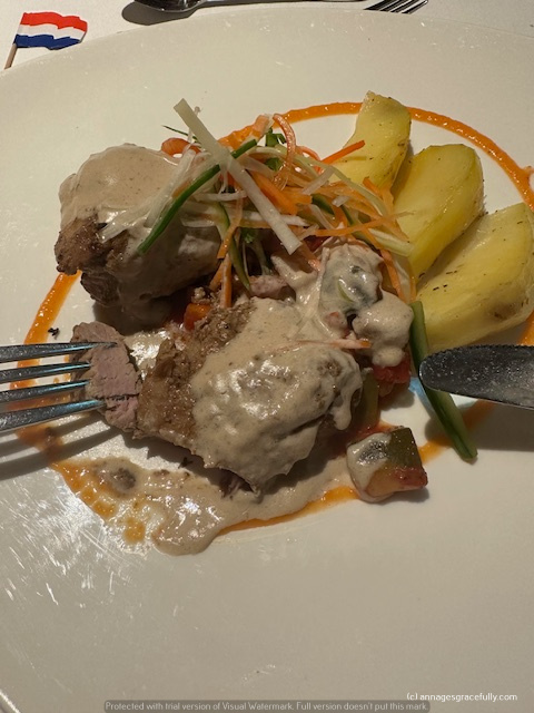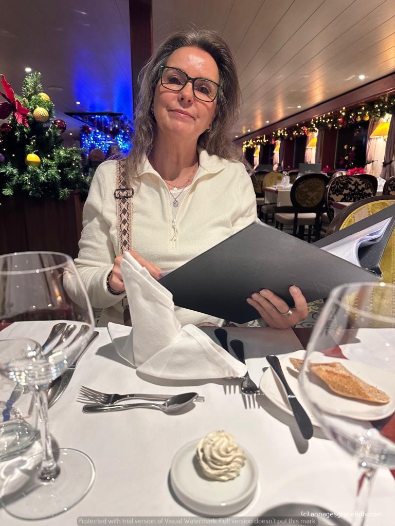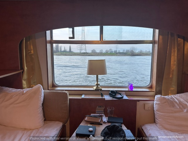 Donderdagmiddag mochten we ons melden aan de kade in Arnhem voor een heuse kerstreis. Het inchecken verliep uiterst soepel en de koffers werden netjes naar de hut gebracht. We zaten helemaal aan het einde van de gang. Mooie hut – wel met twee aparte (en best smalle haha) bedden. Prima douchecabine en plek genoeg om je spulletjes op te bergen. Na een welkom praatje en dito cocktail (voor ons alcohol vrij) stond het eerste diner op de planning.